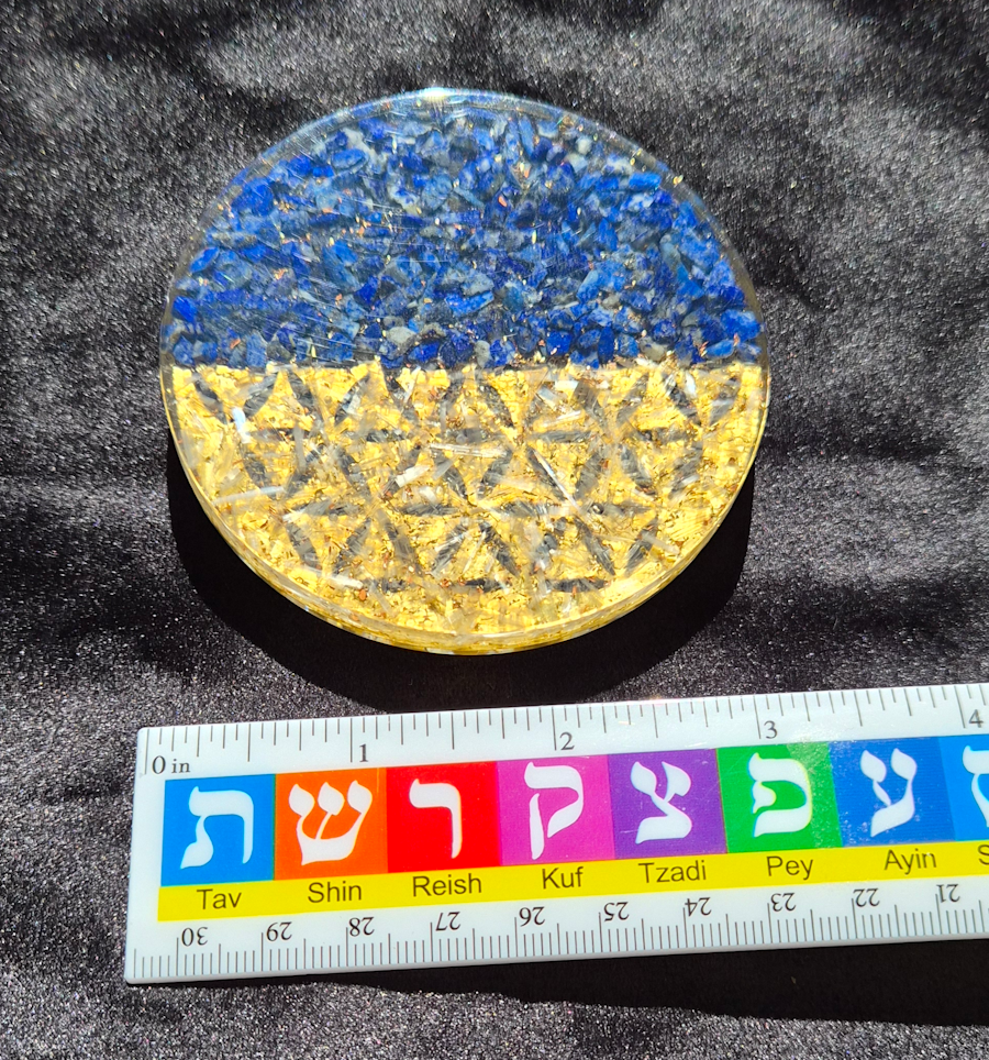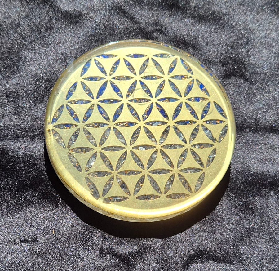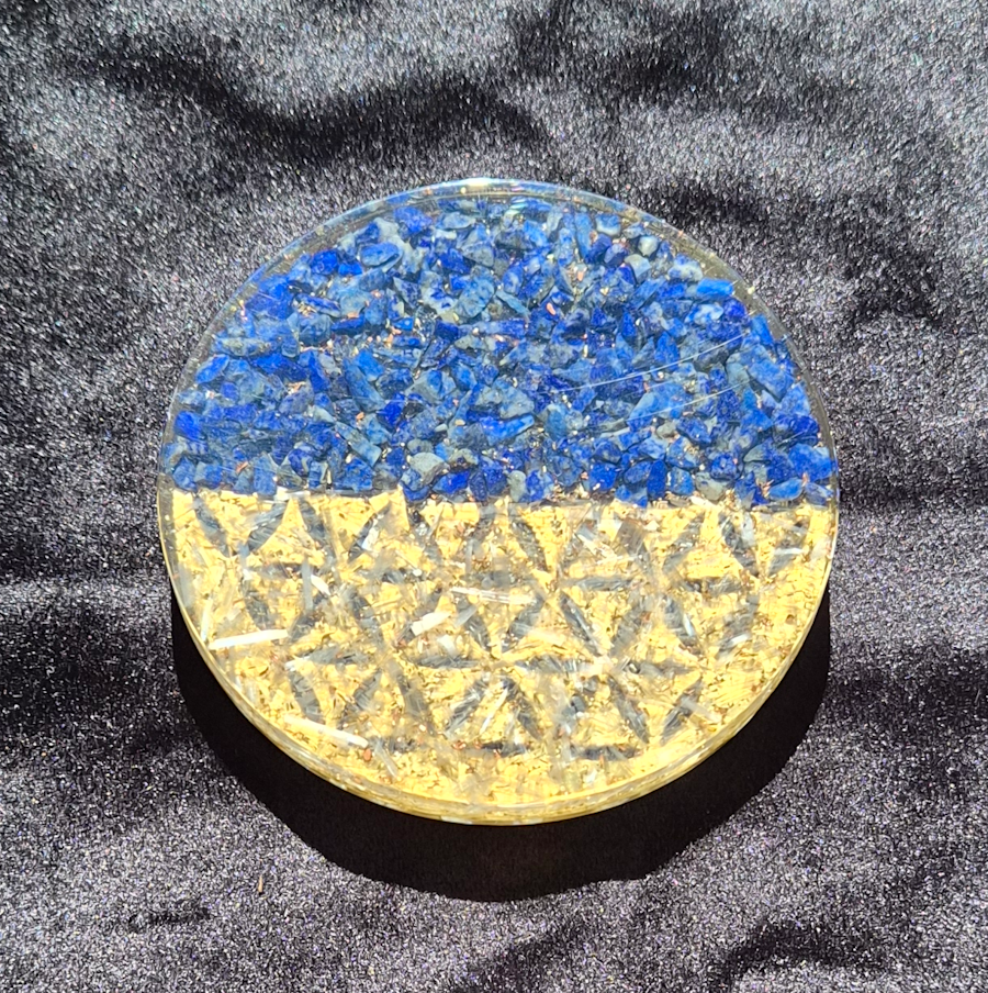 Orgone Lapis Lazuli and Selenite crystal charging plate with a gold Flower of Life sacred geometry Mandala and also with copper and silver flakes.